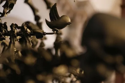 The massive piece is replete with symbols lampooning social media and the surveillance state: intricately hung, molded glass skeletons and skulls, both human and animal; scattered likenesses of the Twitter bird logo; and surveillance cameras.
