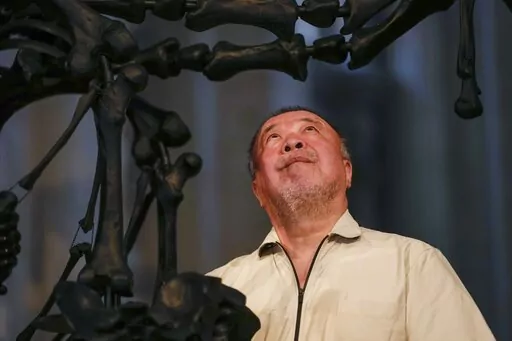 He stands by his 9-meter (29.5-foot), nearly 3-ton black glass sculpture, which is suspended over the central nave of the deconsecrated church of San Giorgio Maggiore, located opposite Venice's St. Mark’s Square. Titled “The Human Comedy: Memento Mori,” the sculpture is the centerpiece of an Ai exhibit at the church that opens Sunday.