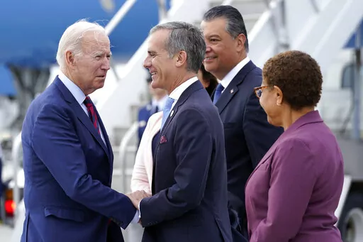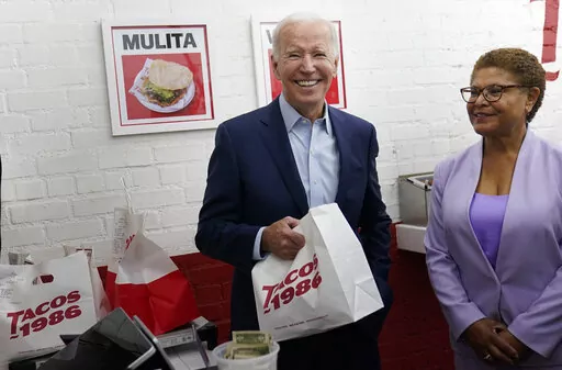 Democratic candidates have been far more likely to appear with Biden at official White House events underscoring their achievements than at overt campaign events. In California, Biden was joined by state lawmakers and the city's mayor, and he called them out individually. Rep. Karen Bass, who is running for mayor of Los Angeles, made a takeout run with Biden to a taco shop.