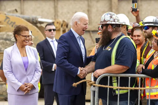 In Los Angeles on Thursday, at a construction site for an extension on the city’s subway line, he spoke about his massive infrastructure law. Giant cranes rose up behind him as he stood before bulldozers and excavators. Many on hand were hard-hat workers in construction orange.