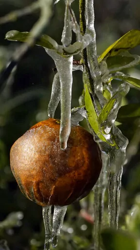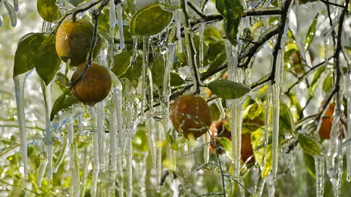 The National Weather Service said Sunday it's all going to warm up nicely after the weekend. The low temperatures near freezing are quite rare in Florida, but at first glance the citrus, strawberry and tomato winter crops suffered no major damage. Farmers spray water onto the crops to help protect them from the cold.
