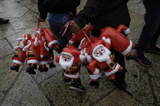 Under a banner that read “Bethlehem's Christmas bells ring for a cease-fire in Gaza,” a few teenagers offered small inflatable Santas, but no one was buying.