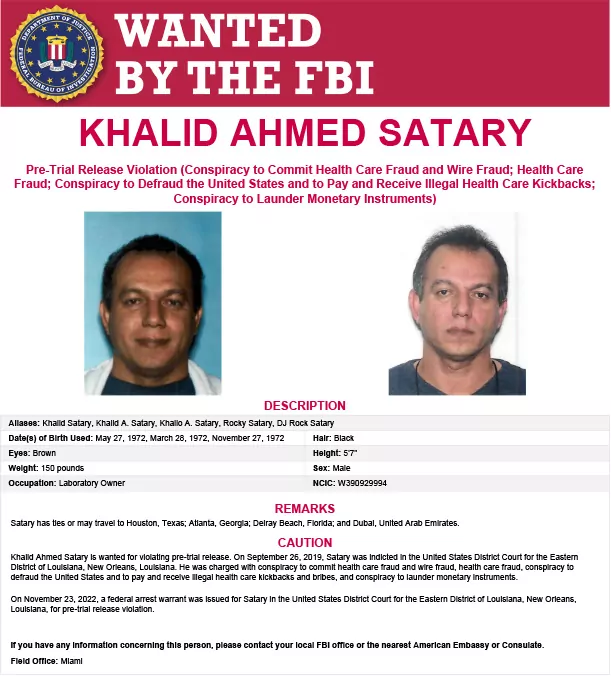 Khalid Ahmed Satary is wanted for violating pre-trial release. On September 26, 2019, Satary was indicted in the United States District Court for the Eastern District of Louisiana, New Orleans, Louisiana. He was charged with conspiracy to commit health care fraud and wire fraud, health care fraud, conspiracy to defraud the United States and to pay and receive illegal health care kickbacks and bribes, and conspiracy to launder monetary instruments.