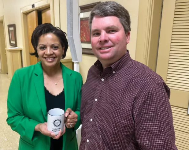 Tracy Harden, owner of Chuck’s Dairy Bar in Rolling Fork, told the Indianola Rotary Club this week her survival story from the March 24, 2023 tornado that destroyed her business and much of the small town. She is pictured, left, with Rotarian James Robertson.