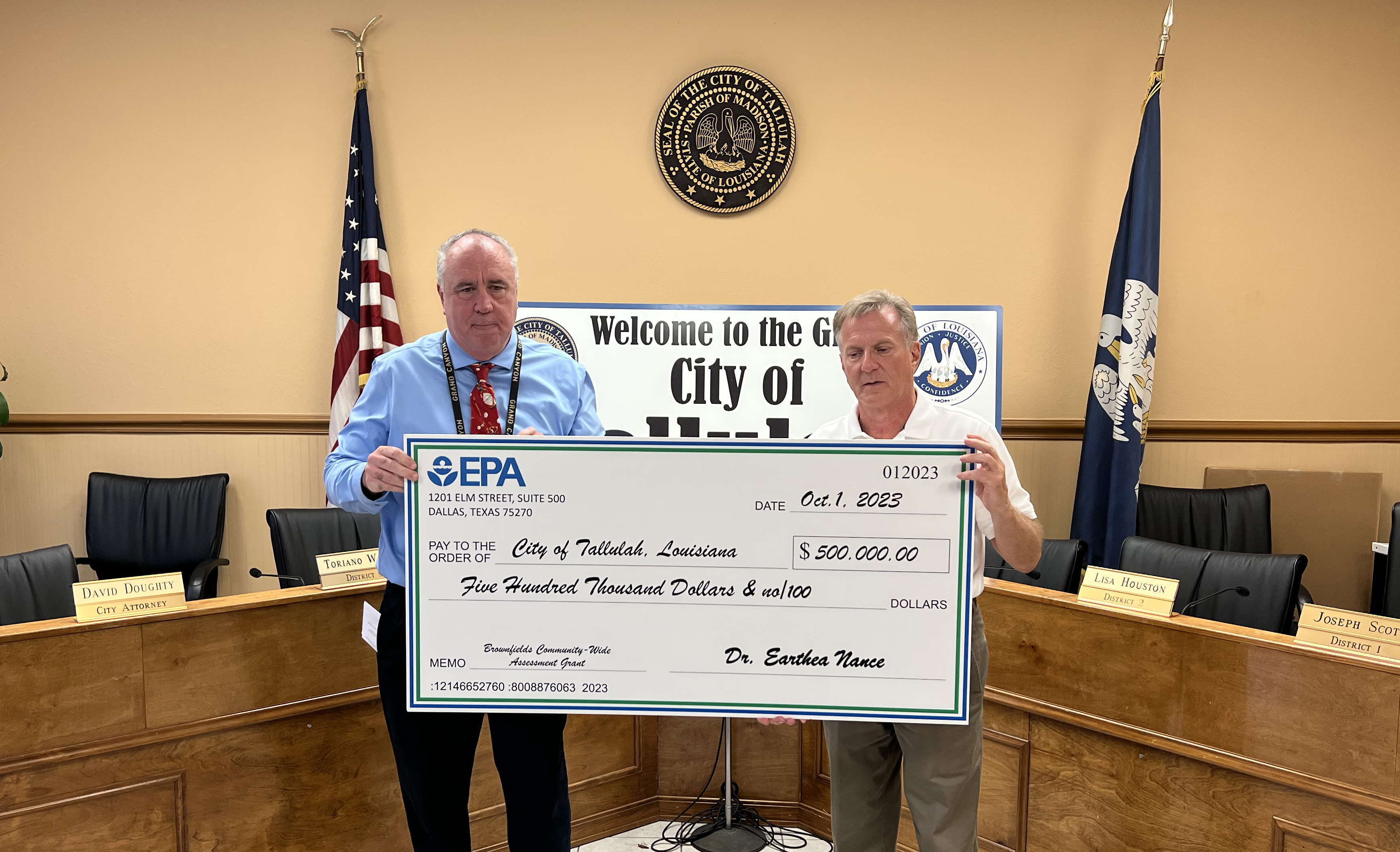 The City of Tallulah was presented with a check for a $500,000 grant to go toward rehabilitation of old, unsafe, and/or underutilized properties in town Tuesday during a special ceremony held at city hall.