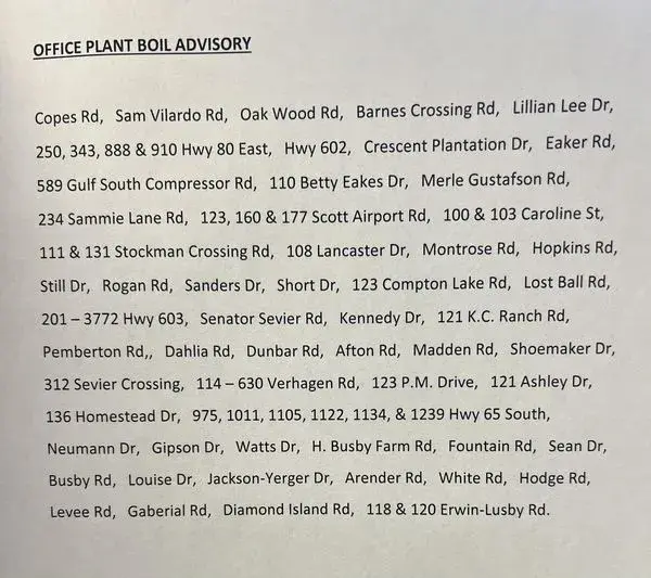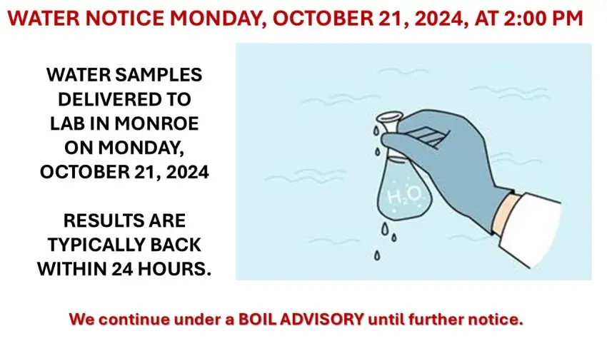 Water Update Monday, October 21, 2024, at 2:00 pm: Water samples delivered to lab for analysis. We will receive results within 24 hours to see if the current Boil Advisory can be rescinded. Until that time, WE CONTINUE UNDER A BOIL ADVISORY. WATER SHOULD BE BOILED AT A RAPID PACE FOR TWO MINUTES BEFORE USE OR CONSUMPTION.