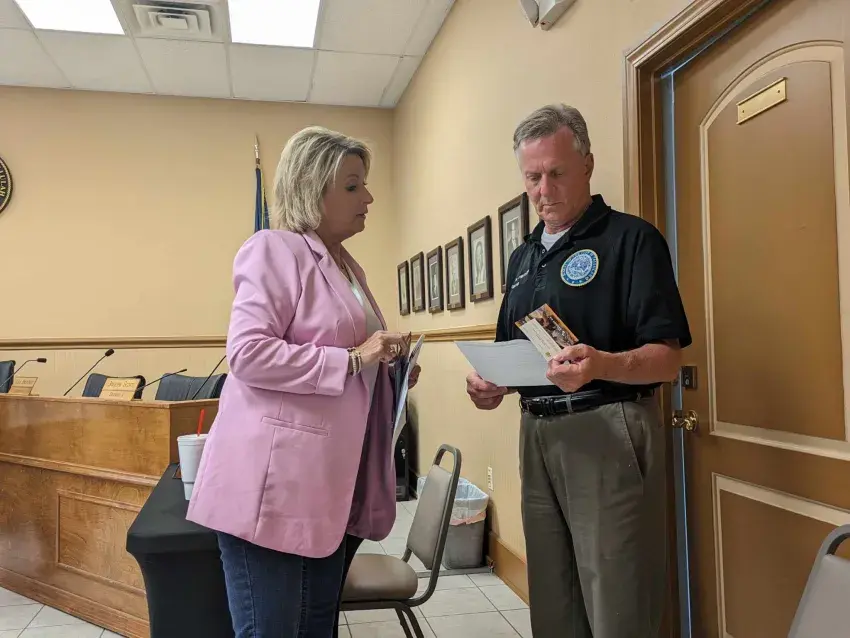 US Sen. Bill Cassidy’s office came to Tallulah City Hall on June 12 to provide citizens with an opportunity to discuss different issues. A handful of citizens were present. Here, Angie Robert (left), Northeast Regional Director from US Cassidy's office, provides Tallulah Mayor Charles Finlayson with information.