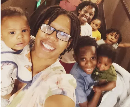 Pictured from left in the bottom row are, Ahkari Washington, son; Brittny Sims Washington, mother; Gregory Washington, Jr, son; and Akachi Washington, Jr., son. Pictured in the top row from left are Melanie Washington, daughter; Braxten Sims Washington, son; and Ambrosiah Washington, daughter.