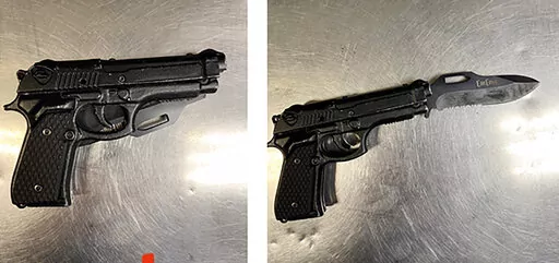 He was carrying a replica handgun with a large blade that folded out of it similar to a pocket knife, according to a photo released by police.