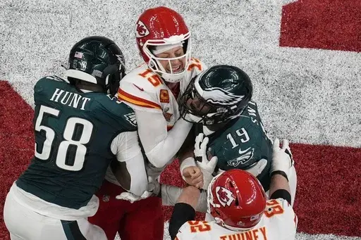 Philadelphia had taken a 10-0 lead and the two-time defending champs were on the ropes when Mahomes was sacked by the Eagles' Josh Sweat. On the next play, Sweat bottled him up again. And on the ensuing play, the two-time NFL MVP was under such duress that Mahomes threw an interception that Cooper DeJean returned 38 yards for a score.