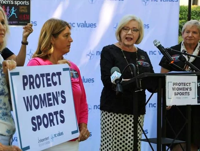 Tami Fitzgerald, center, the executive director of the conservative North Carolina Values Coalition, advocates for a bill banning transgender girls from competing in girls' school sports, Wednesday, Aug. 16, 2023, outside the Legislative Building in Raleigh, N.C. Republican state lawmakers will attempt later Wednesday to override the Democratic governor's veto of the legislation. (AP Photo/Hannah Schoenbaum)