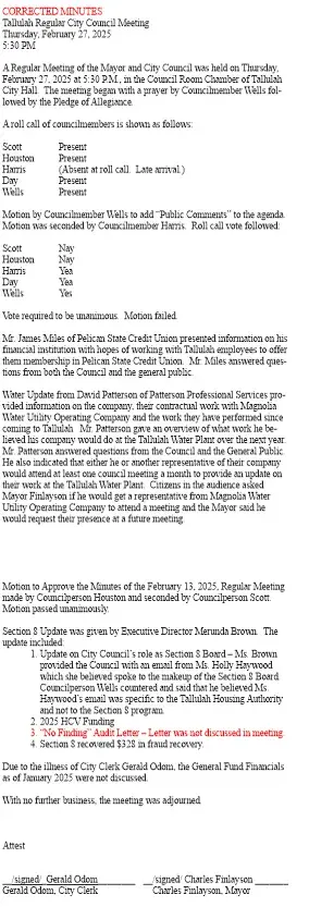 A Regular Meeting of the Mayor and City Council was held on Thursday, February 13, 2025 at 5:30 P.M., in the Council Room Chamber of Tallulah City Hall. The meeting began with the Pledge of Allegiance followed by a prayer by Councilmember Wells.