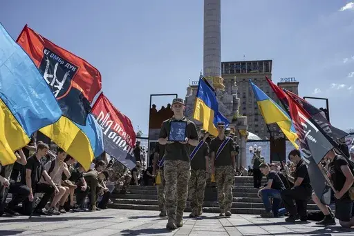 At the farewell ceremony, Ukrainian soldiers carried Fouché's coffin through Kyiv’s landmark Independence Square, the site of mass protests in 2014 that forced out a pro-Russian president, towards a memorial for the country's fallen defenders. Fouché's comrades held back tears as they lined up to say goodbye. Mourners read prayers as they held up Ukrainian flags and military banners.