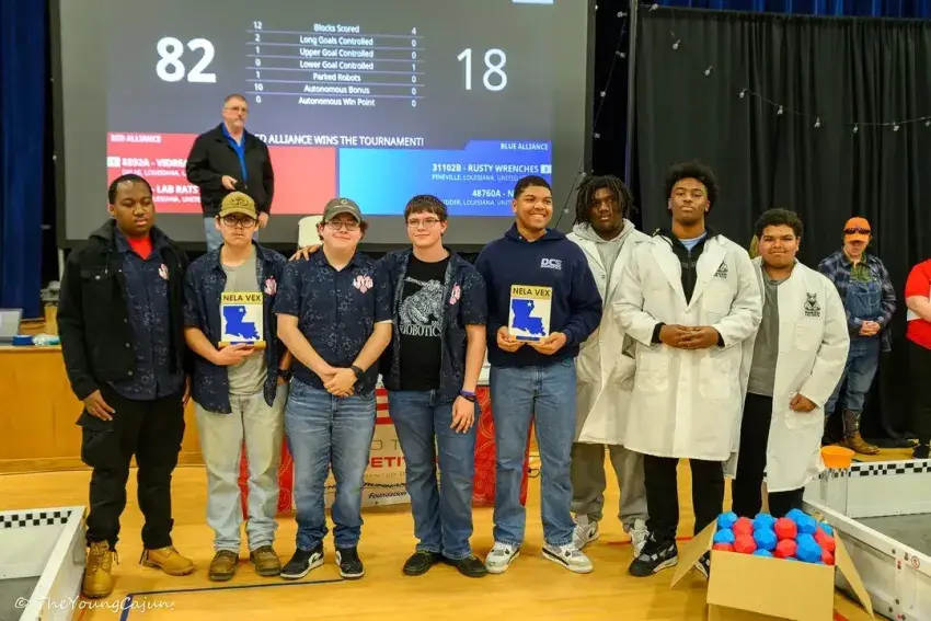 DCS senior team "The Vidreams" (Frederic Curlin, Logan Patty, Michael Ivy, Hunter Scarborough) and freshman team "Lab Rats" (Khristian Washington, Lanaris Robinson, Nicholas Burgess, Kalvin Hardy) win Tournament Champions at the NELA VEX Robotics Tournament.