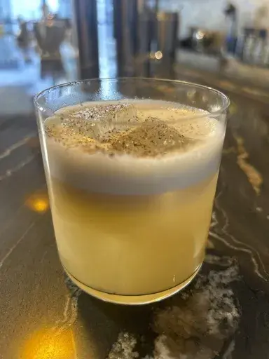 Build the cocktail in the shaker, then dry shake. Add ice and shake the cocktail, double strain in a rock glass over ice, garnish with grated nutmeg