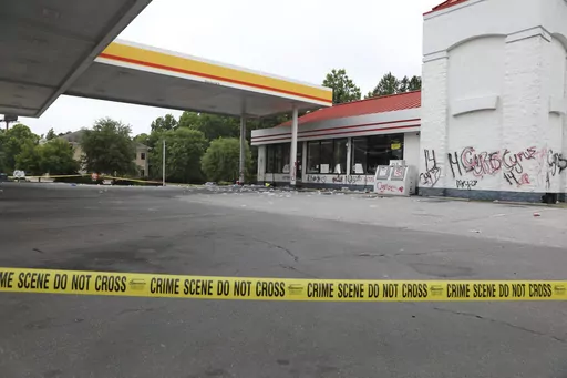 The entire gas station was behind yellow crime scene tape Tuesday morning. Dozens of crushed water bottles littered the parking lot. Graffiti, most of it “Cyrus” or “14” covered the walls.