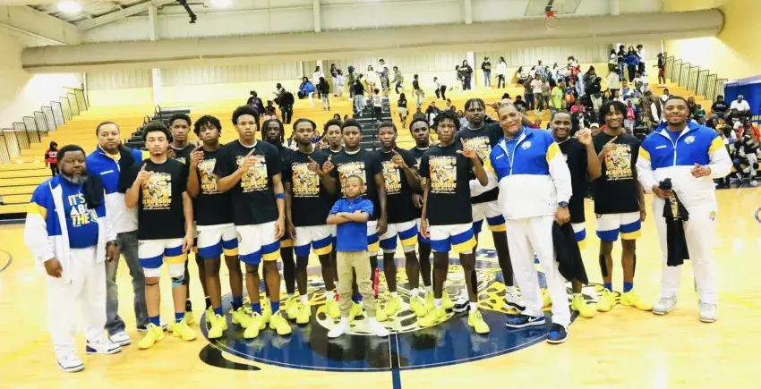 Madison High School senior Jaydon Larry signs with the University of Ottawa. In front from left are Larry’s grandmother Cynthia Jolly, Jaydon Larry, mother Kamacha Guinn and sisters Justice Larry and Elisha Brown. In back from left are coaches Marvin Brady, Kevin Jones, Tori Thomas, Alaysia Hicks, head coach Levi Washington and Chris Herring.