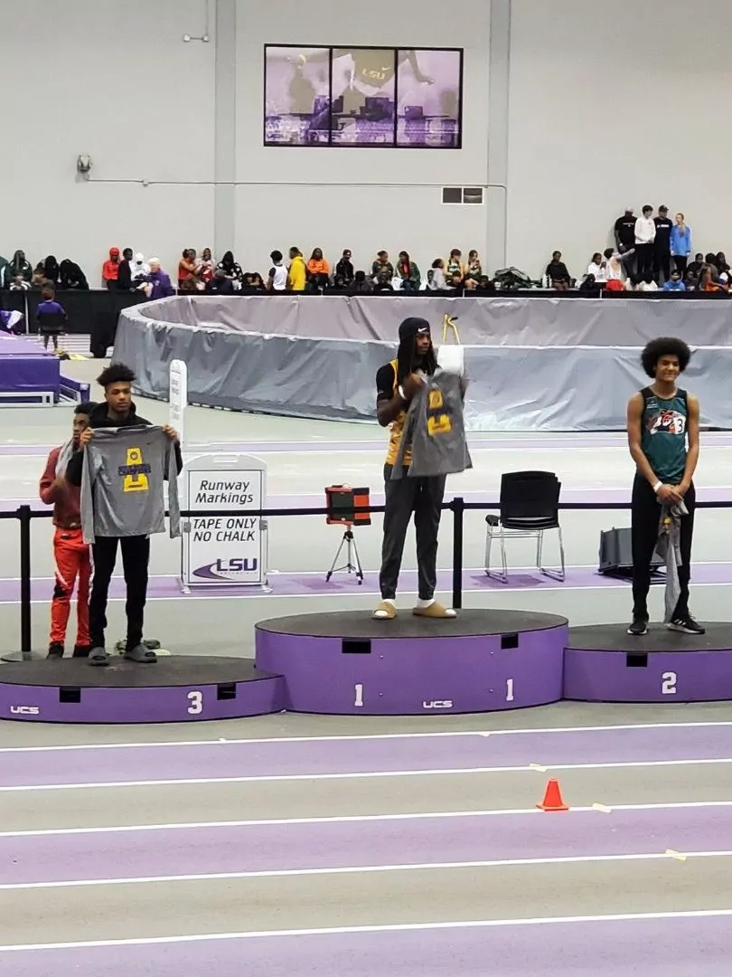 Delhi Charter School track and field athletes Marcus Carter, Tayven Carter, Deandra Young, Kiedron Thomas, and Kimrey Thomas all competed February 3 at LSU indoor stadium for a chance to qualify for the LHSAA indoor track championship February 17. Marcus Carter is in the 4x200 meter relay, Tayven Carter is in the 4x200 meter relay, long jump, and triple jump, DD Young is in the 4x200, long jump, Kiedron Thomas is in the 4x200 and 60 meter dash, and Kimrey Thomas is in the shot put. Tayven Carter placed third in the triple jump, breaking the DCS school record and registering the 57 best triple jump in the nation at 45 feet 6.5 inches.