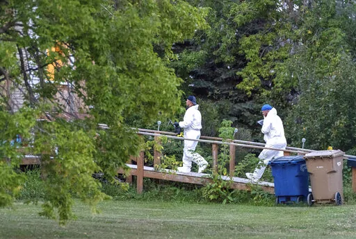 Blackmore said police began receiving reports before 6 a.m. of stabbings on the First Nation community. More reports of attacks quickly followed and by midday police issued a warning that a vehicle reportedly carrying the two suspects had been spotted in Regina, about 335 kilometers (208 miles) south of the communities where the stabbings occurred.