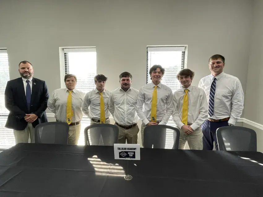 Assistant coach Matt Homan, Jon Fortenberry, Owen Martin, assistant coach Kelvin Newton, Tripp Gayle, Charlie Vinning, Head coach Ryan Williams at the MAIS Championship media day press conference. The senior players and coaches are headed with their team to play for the championship on Friday in Jackson, Mississippi.
