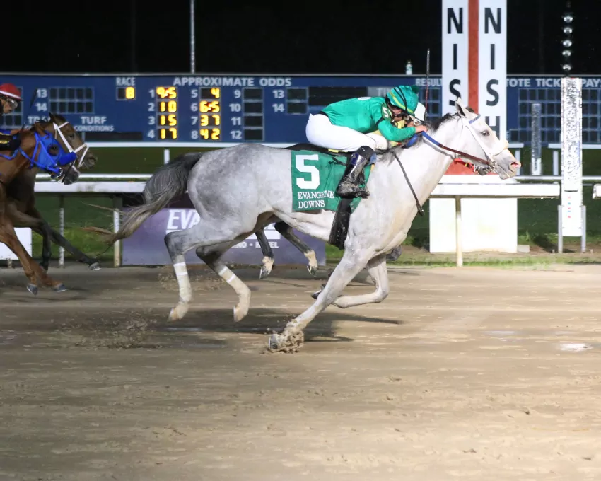 OPELOUSAS, LA –The 2023 Evangeline Downs Thoroughbred season kicked off with a pair of stake races Friday night. A G’s Charlotte picked up a stylish looking victory in the Spotted Horse, while Taylors Tap rallied in the final yards to capture the Acadiana. The opening night card was contested over a track listed as muddy after substantial overnight rains.