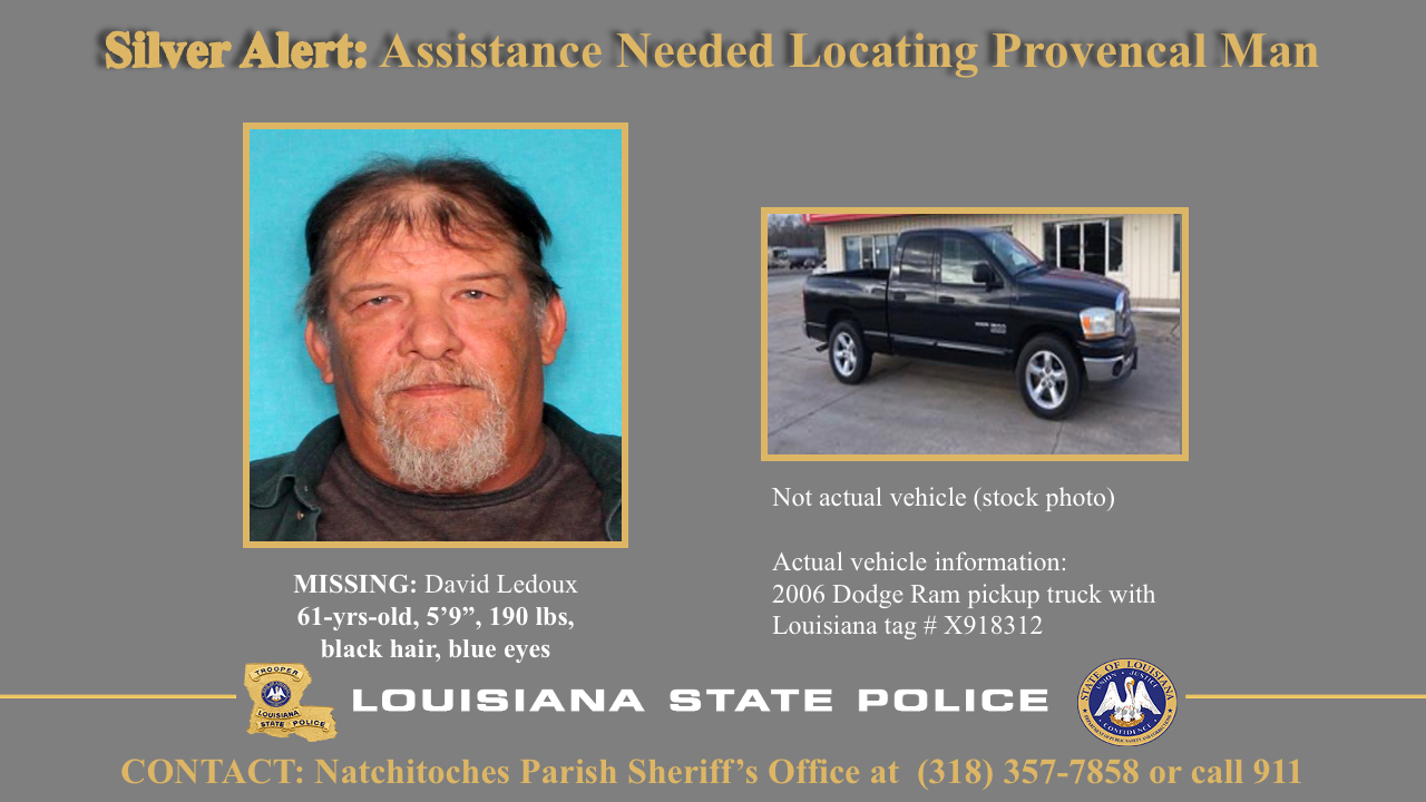 Provencal - The Silver Alert for David Ledoux has been cancelled. Ledoux has been located. Please refer all inquiries to the Natchitoches Parish Sheriff’s Office.
