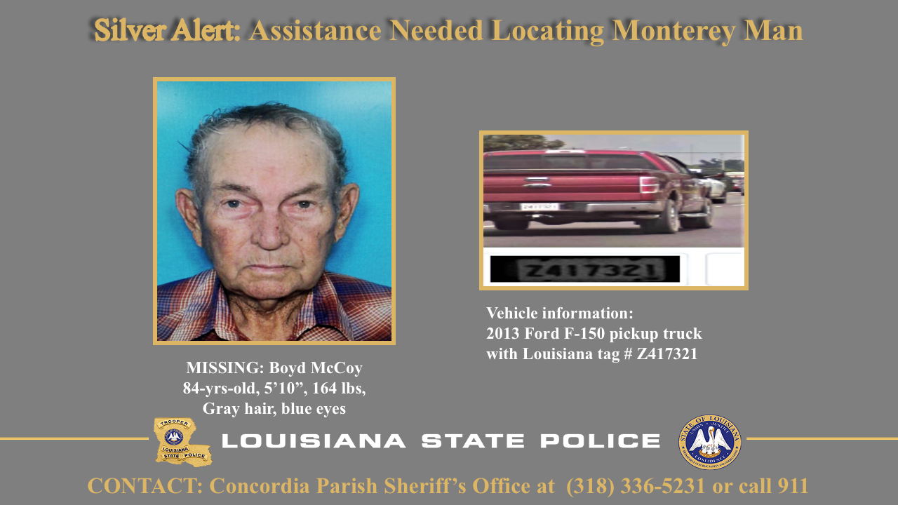 Concordia Parish – Louisiana State Police have issued a Silver Alert on behalf of the Concordia Parish Sheriff’s Office for 84-year-old Boyd McCoy.