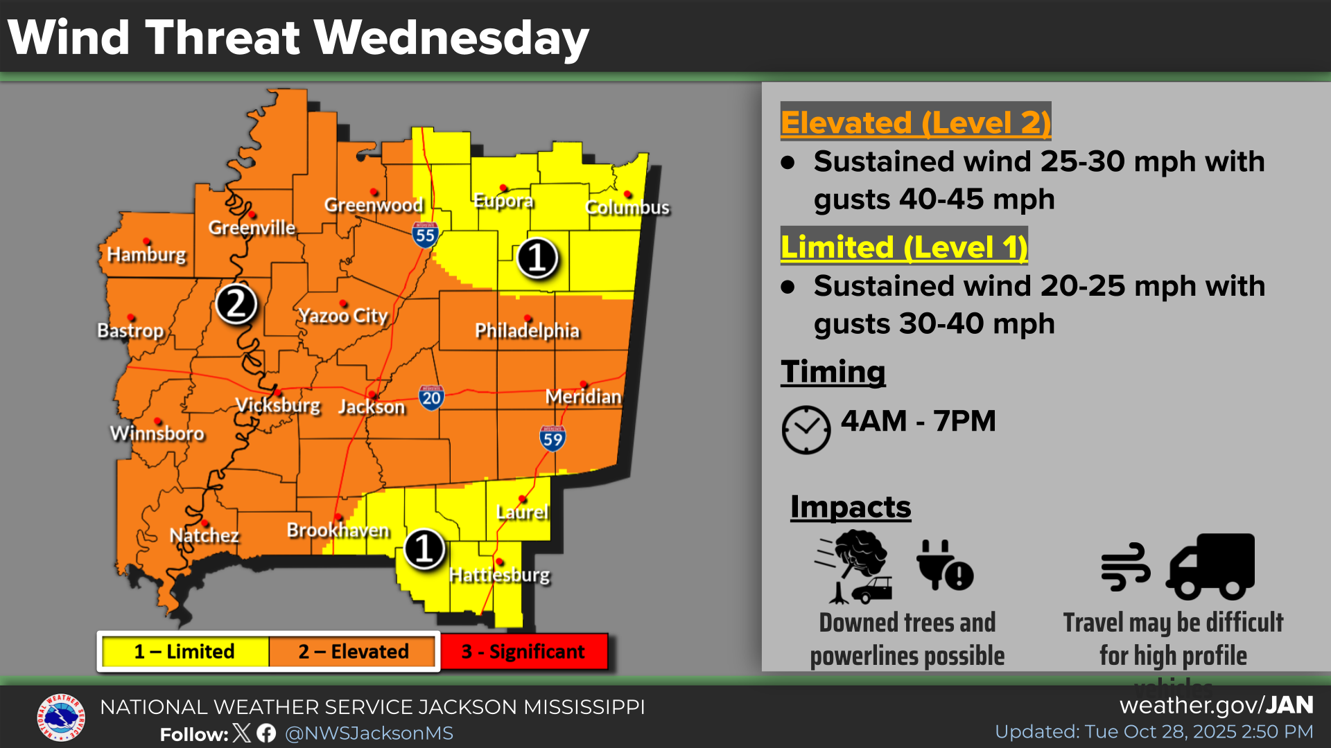 According to the advisory, west winds between 15 and 25 miles per hour are expected, with gusts reaching up to 40 miles per hour. The affected area includes portions of northeast Louisiana, southeast Arkansas, and much of central and western Mississippi.