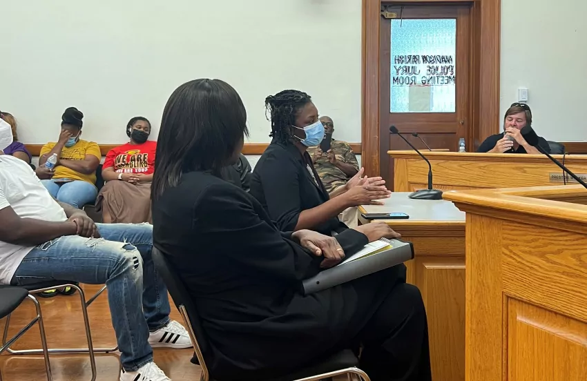 Former Madison Parish Hospital nurse practitioner Latayatacha Ross, in mask, answers questions from former Second Circuit Court of Appeal Chief Judge Felicia Toney Williams, in foreground, in front of the Madison Parish Police Jury Monday night.