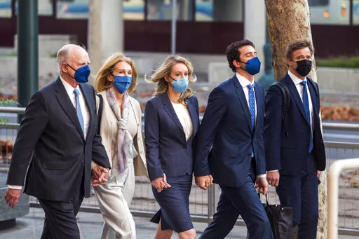 Elizabeth Holmes walks into federal court in San Jose, Calif., Monday, Nov. 22, 2021. Holmes is accused of duping elite financial backers, customers and patients into believing that her startup was about to revolutionize medicine. (AP Photo/Nic Coury)
