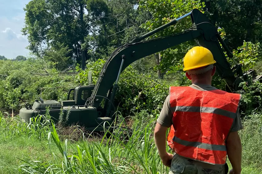 Louisiana Army National Guard Soldiers with the 843rd Horizontal Engineer Company, 205th Engineer Battalion, 225th Engineer Brigade clear and grub a drainage canal constructed near Louisiana State University of Alexandria, Alexandria, Louisiana, July 20, 2022. The project was a part of the innovative readiness training, a DoD collaborative program that leverages military contributions and community resources to multiply value and cost savings for participants. (U.S. Army National Guard courtesy photo)