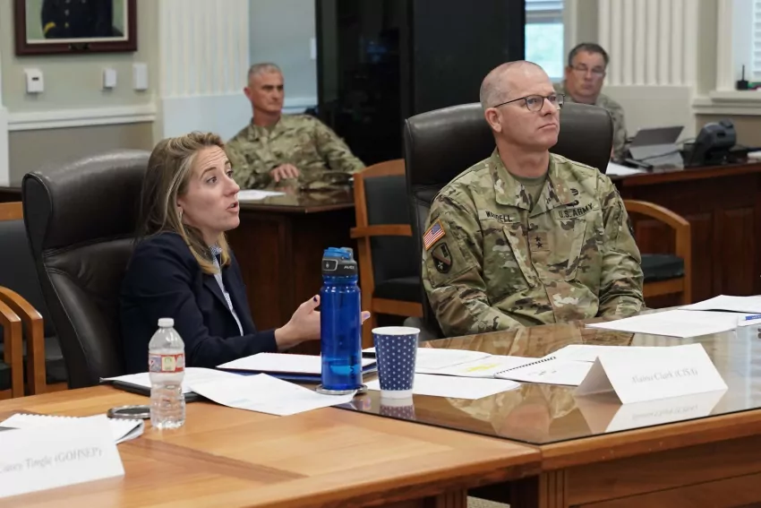 Alaina Clark, Cybersecurity and Infrastructure Security Agency assistant director for stakeholder engagement, speaks at a Council of Governors cybersecurity workshop at Jackson Barracks, New Orleans, Feb. 1, 2023. The workshop brought together state and federal partners from the National Geospatial-Intelligence Agency, the National Guard Bureau, Cybersecurity and Infrastructure Security Agency, Louisiana and Wyoming to discuss how to strengthen partnerships between the federal government and state governments to better protect the U.S. from cyber threats to homeland security and all types of hazards. (U.S. Army National Guard photo by Capt. Peter Drasutis)