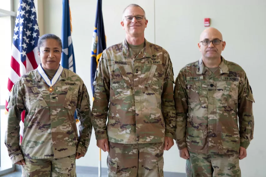 (From left to right) Col. Katrina Lloyd, outgoing commander of the 61st Troop Command, Maj. Gen. Keith Waddell, adjutant general of the Louisiana National Guard, and Lt. Col. Joseph Barnett, incoming commander of the 61st, stand together during an official change of command ceremony at Camp Beauregard, Pineville, Louisiana, Oct. 16, 2022. (U.S. Army National Guard photo by Spc. Madalyn McQuillan)