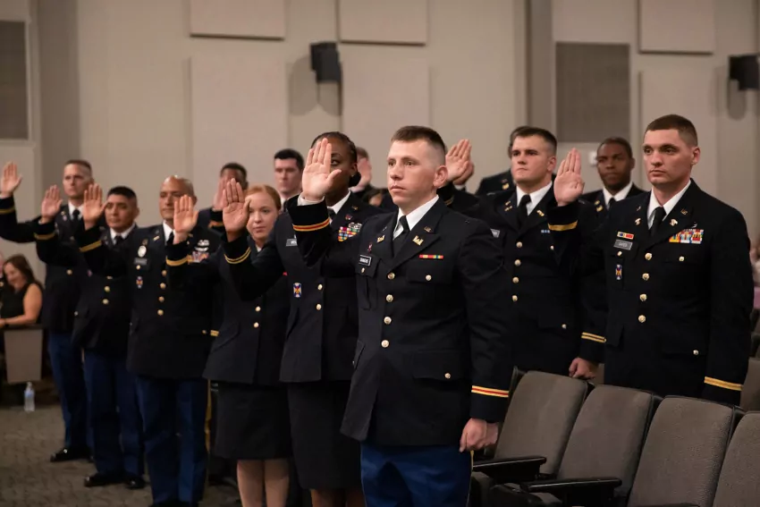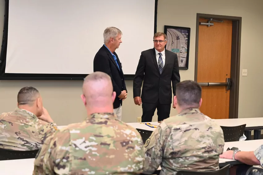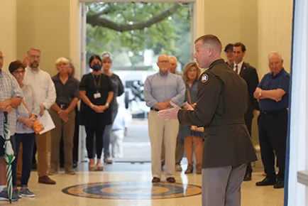 Brig. Gen. Thomas Friloux, LANG director of joint staff, speaks to guests during a showcase of Hufft Hall at Jackson Barracks in New Orleans, Oct. 12, 2022. The LANG along with the Historic New Orleans Collection, the Preservation Resource Center of New Orleans and the Urban Land Institute Louisiana Chapter hosted the showcase. (U.S. Army National Guard photo by Spc. Duncan Foote)