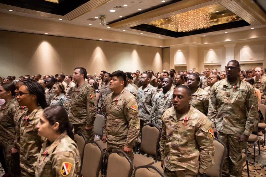 Over 250 Louisiana National Guardsmen from the 527th Engineer Battalion and 1022nd Engineer Vertical Construction Company were honored and awarded the Louisiana War Cross during an awards ceremony following their Yellow Ribbon Reintegration Training event in Baton Rouge, Louisiana, May 15, 2022. The 527th, headquartered in Ruston, Louisiana, returned last December following a nearly year-long deployment to the Middle East where they conducted horizontal and vertical construction operations throughout Kuwait, Iraq, Syria and Qatar. (U.S. Army National Guard photo by Spc. Madalyn McQuillan)
