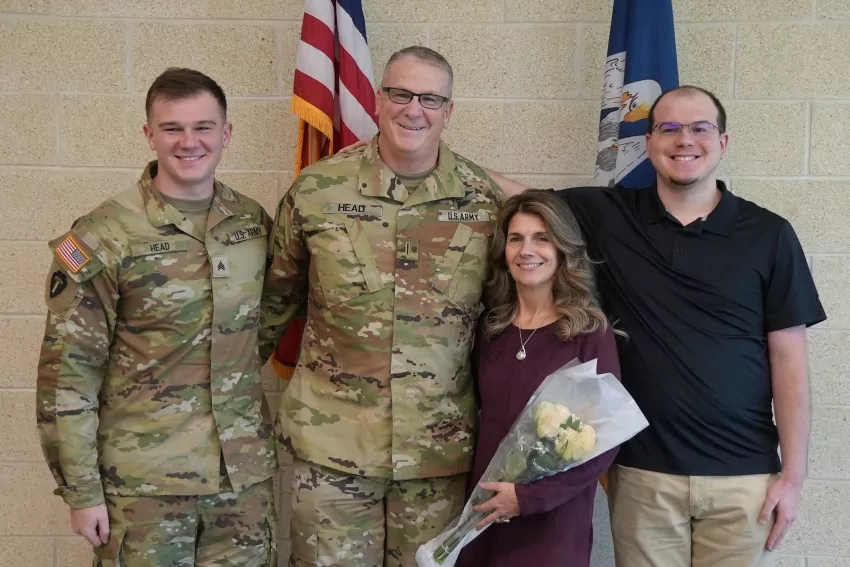 Newly promoted Chief Warrant Officer 5 Mark Head stands with his wife, Bridgette, and two sons, Mitchell and Tristan, during his promotion ceremony at the Army Aviation Support Facility #1 in Hammond, Louisiana, on Oct. 13, 2023. (U.S. Army National Guard photo by Spc. Duncan Foote)