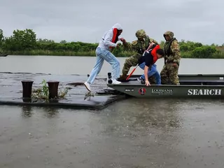 Airmen with the 159th Fighter Wing conduct simulated boat rescues in Belle Chasse, Louisiana, April 21, 2023. The Louisiana Air National Guard conducted simulated search and rescue missions and commodities distribution as part of the LANG's annual Disaster Response Exercise. (U.S. Air National Guard photo by Maj. Larissa Lambert)