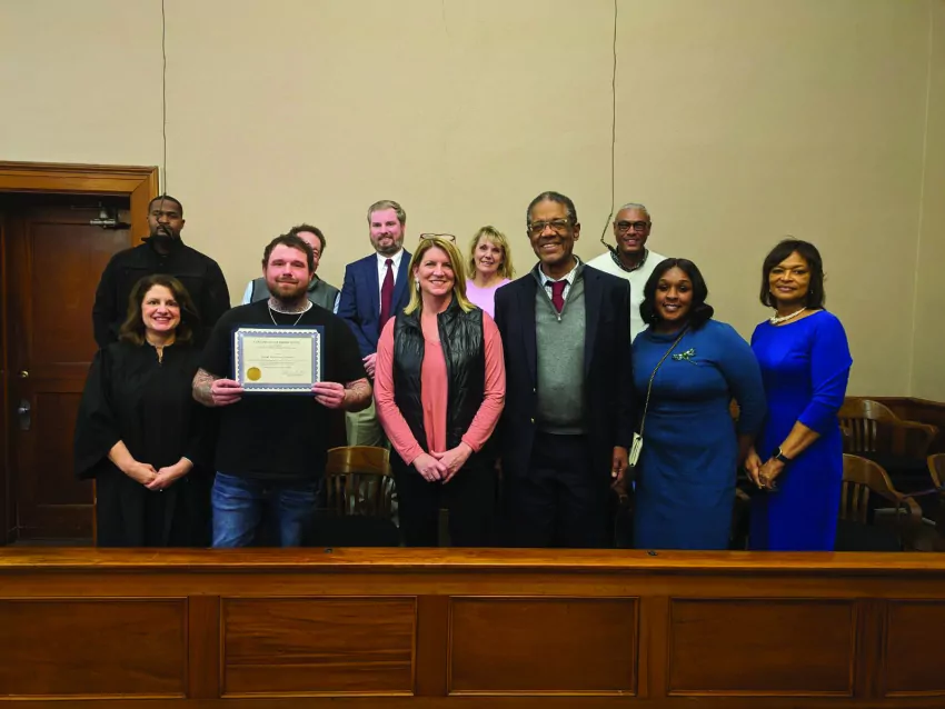 David Emerson graduates from Drug Court. In back are Deputy Felton Moore, Madison Parish Sheriff’s Office, from left, John Hogue, Chief Public Defender, Bradley Sloane, Assistant District Attorney, Burnie Ratcliff and Joseph Jackson, Delta Recovery. In front are Judge Laurie Brister, from left, Emerson, Renea Keahey, Raymond Cannon, Public Defender, Brittany Smith, Drug Cour Coordinator, and Elisha Lucas, Delta Recovery.