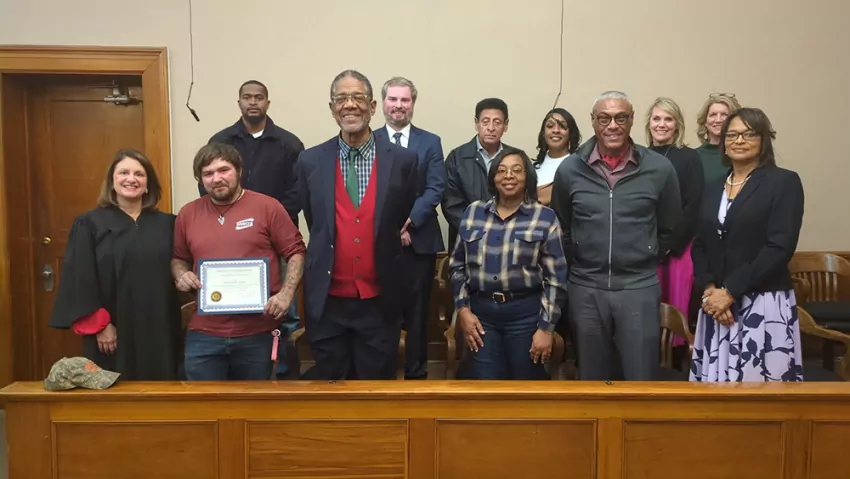 Clifton Dakota Thomas is the fifth Sixth Judicial Drug Court graduate. In the front row are Judge Laurie Brister, from left, Thomas, Raymond Cannon, Alisa Bell, Joseph Jackson and Elisha Lucas. In the back row are Deputy Felton Moore, from left. Bradley Sloane, Iree Jackson, Brittany Smith, Burnie Ratcliff and Renea Keahey.