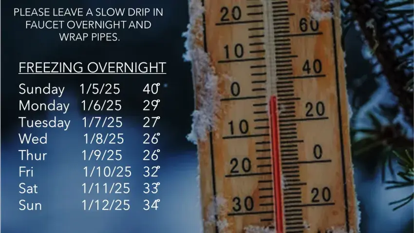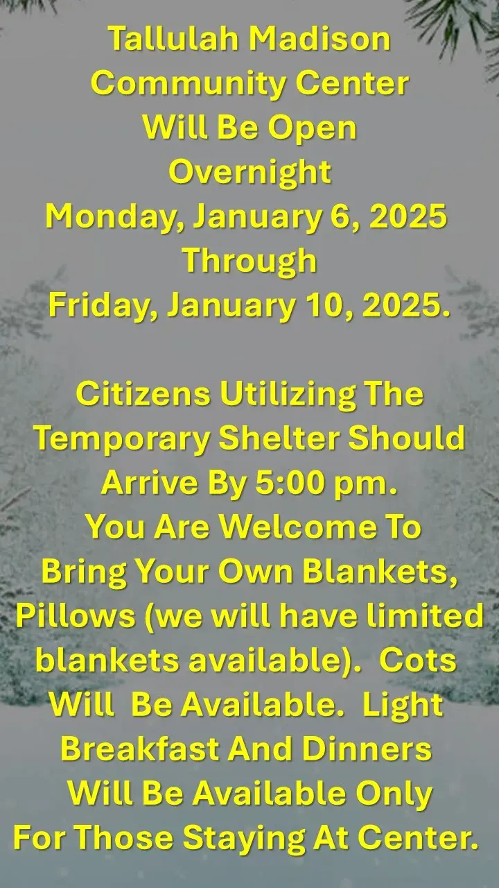 If you know of someone who may need an indoor place to stay during this winter weather event, the Community Center will be open overnight Monday, January 6, 2025, through Friday, January 10, 2025.