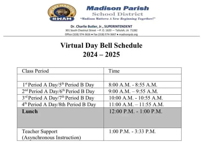 Due to some unrest in our community, Madison Parish Schools will go virtual tomorrow (October 25). The safety of our scholars on the way to school and returning is of the upmost concerns. We will return to in-person learning Monday, October 28.