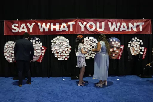 Beyond the main stage, an exhibition hall was filled with tables selling MAGA merchandise, including bejeweled purses with Trump's name spelled out in rhinestones. One wall featured large cutouts of each candidate's face. Attendees were encouraged to share thoughts using Post-it notes. DeSantis’ entries ranged from “TRAITOR” to “Trump is your Daddy.” Attendees pegged Trump their “ONLY HOPE” and "The ONLY choice. period,” though also noting he “Might go to jail.”