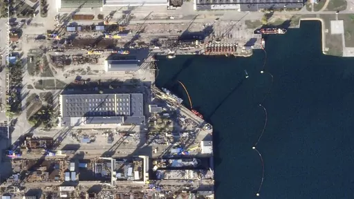 The satellite pictures Sunday from Planet Labs PBC show what appeared to be a firefighting vessel, as well as booms in the water to stop oil leaks from the damaged ship. What appeared to be burn marks can be seen on the vessel, which was still afloat. Those marks were not visible on other satellite images captured of the vessel at port.