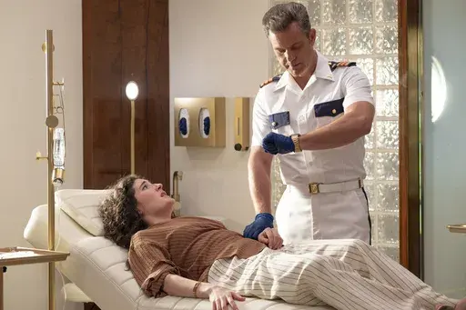 Phillipa Soo and Sean Teale complete the ship’s medical threesome contending with a surprisingly frequent number of bizarre illnesses and accidents that befall the guest stars (episode one: a broken penis). Jackson acknowledges the cases are “absurd and fun and wild and over-the-top,” much to the amusement of his brother, who runs an actual ER.