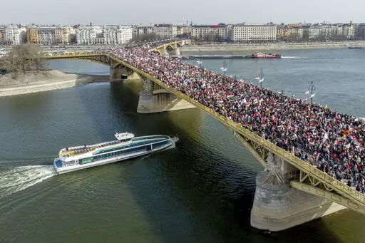 Several hundred thousand Orban supporters gathered Tuesday on the west bank of the Danube River before surging across the city's Margaret Bridge toward the Hungarian Parliament, where Orban spoke at length about the need for Hungary to keep out of the war in Ukraine.