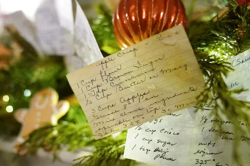Recipes contributed by the small army of volunteer decorators spruce up the China Room's mantel. Handwritten ones — for apple crisp and pizzelle, an Italian cookie — are family recipes shared by the first lady.