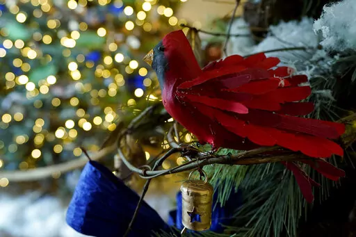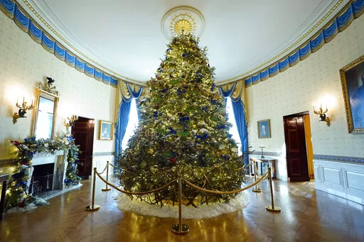 In the Blue Room, the official White House Christmas tree — an 18 1/2-foot (5.6-meter) Concolor fir from Auburn, Pennsylvania — is decorated to represent unity and hope with handmade renderings of the official birds from all 57 territories, states and the District of Columbia.