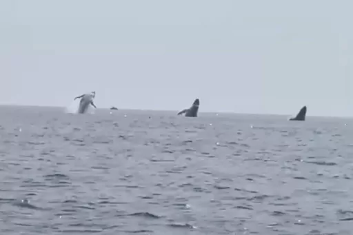 PORSTMOUTH, N.H. (AP) — A New Hampshire man celebrating his birthday on the ocean with his three daughters captured video of something so rare that even marine scientists are jealous — three humpback whales leaping from the water in near perfect unison.
